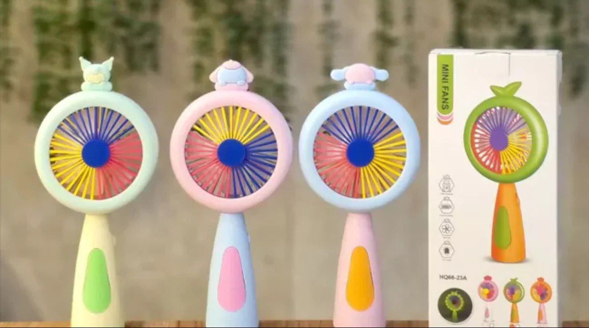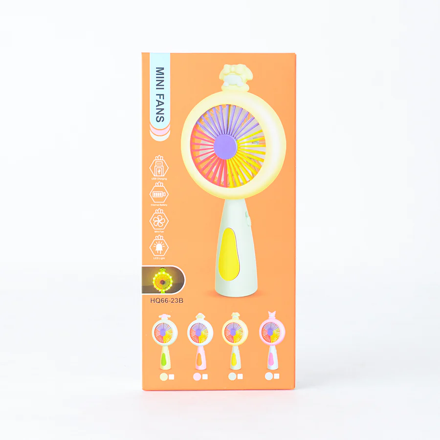 طراحی دستی و قابل حمل : سبک، کوچک و مناسب برای حمل در کیف یا دست.قابلیت شارژ با USB: دارای باتری داخلی قابل شارژ با پورت USB.طراحی رنگارنگ و فانتزی :دارای پرههای رنگی و ظاهر کودک پسند با چند مدل تزئینی مختلف در قسمت بالا.نورپردازی LED: دارای چراغ LED دایرهای اطراف فن برای استفاده به عنوان چراغ خواب یا نور کمکی.پرههای نرم و ایمن: مناسب برای استفاده کودکان.موتور بیصدا با قدرت مناسب خنککنندگی کلید روشن/خاموش و تنظیم حالت: دکمه فیزیکی روی دسته برای کنترل فن و نور.... مینی فن دستی مدل HQ66-23B یک گزینه ایدهآل برای روزهای گرم سال است. این فن کوچک و قابل حمل، با طراحی رنگارنگ و فانتزی خود نه تنها خنککنندهای کاربردی است بلکه جلوهای دوستداشتنی و کودکپسند دارد. با قابلیت شارژ USB، چراغ LED دایرهای اطراف فن، و پرههای ایمن و نرم، این مینی فن انتخابی مناسب برای کودکان، دانشآموزان و حتی استفاده در سفر و محیطهای کاری است.